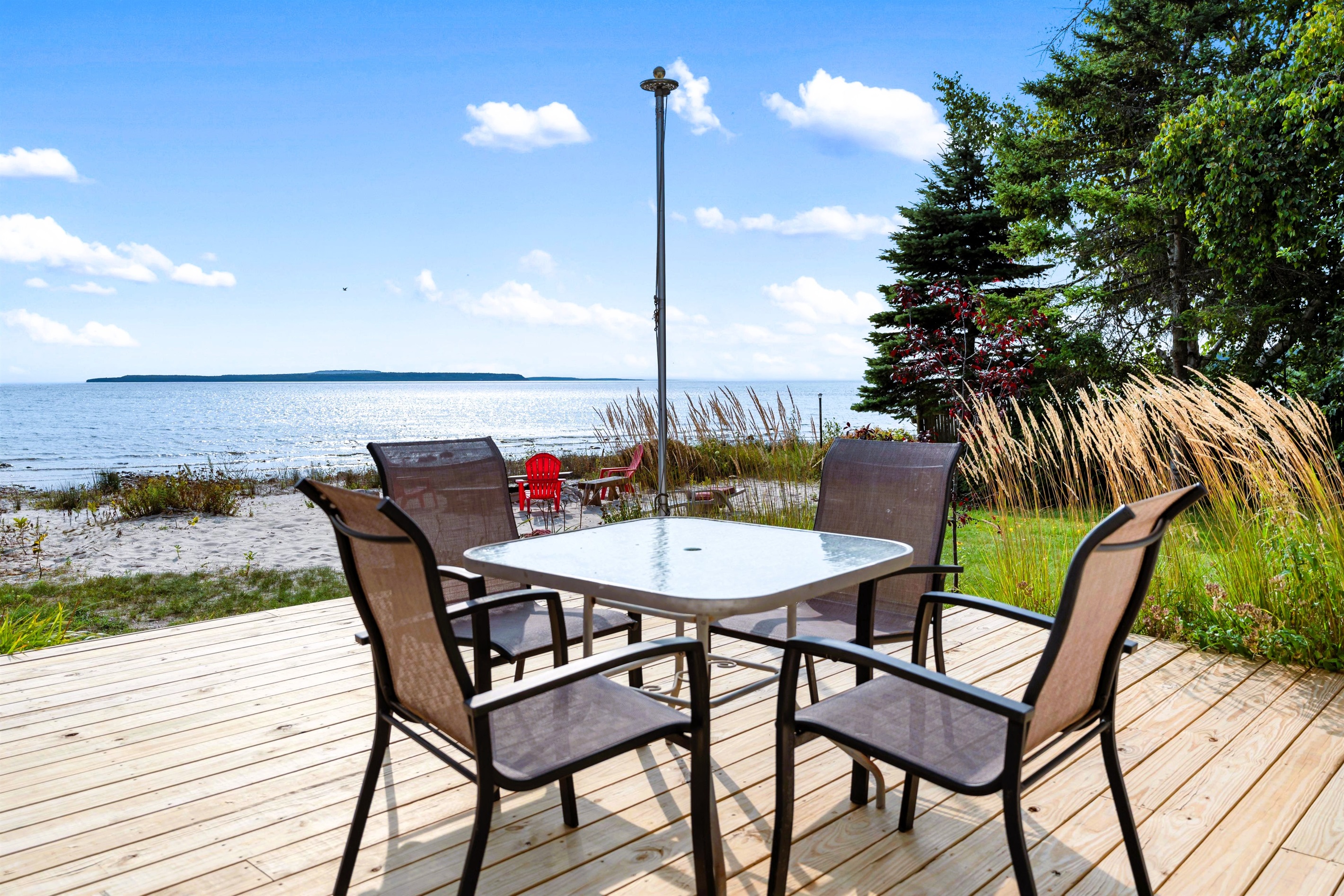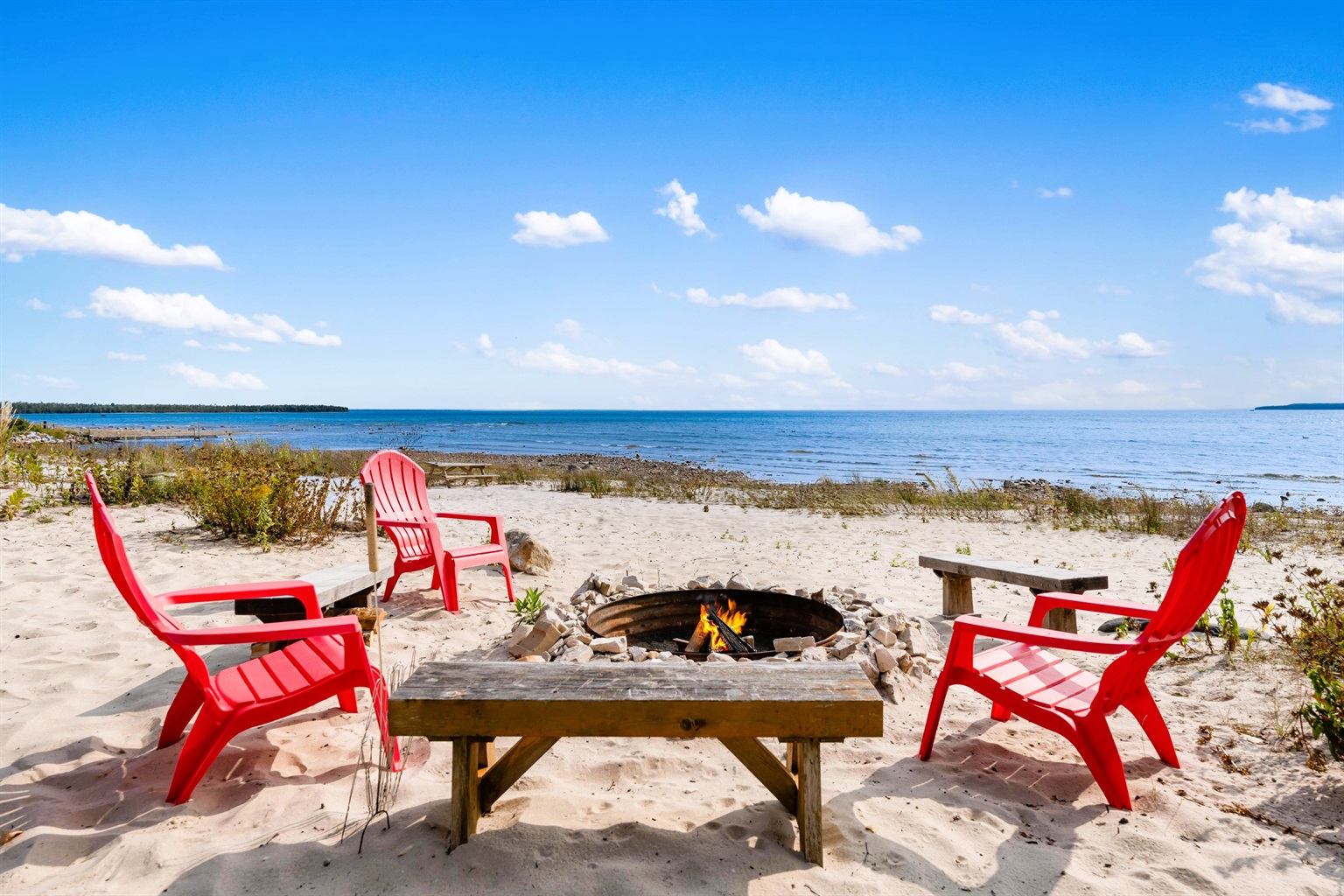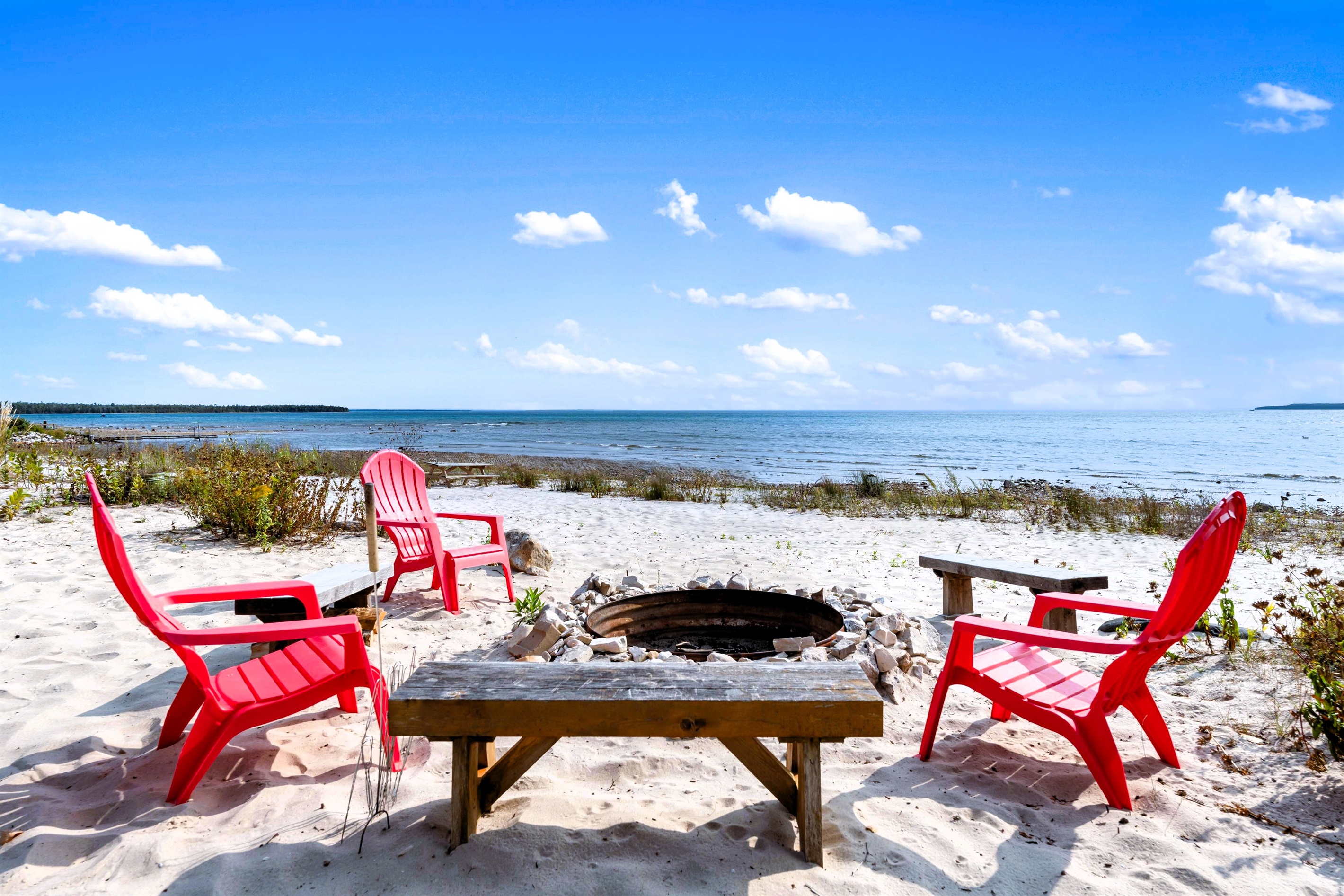 2 Bedrooms • 2 Bathrooms 2 Baths • Sleeps 1-8This stylish Lake Huron beach cottage sleeps 8 and overlooks Mackinac Island. Offering a new deck facing water, 125 feet of soft sandy beach frontage. There is a beach fire pit for those chilly evenings, large private yard, gas grill on back patio, outdoor seating, picnic table on beach and a table/chairs on the top deck. Inside there are 2 bedrooms, with 3 separated sleeping spaces, so you can have two families join and everyone has their own space. In these rooms you will find 3 queen size beds, & a full size bed, several large windows, ceiling fans, modern amenities including Central AC/Heat, new washer/dryer & Dishwasher