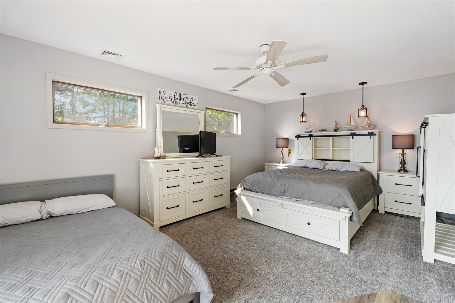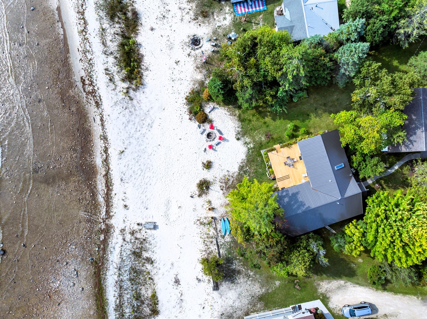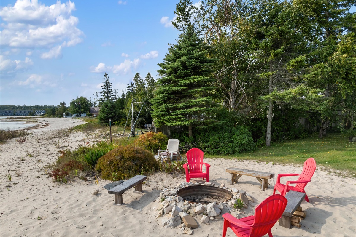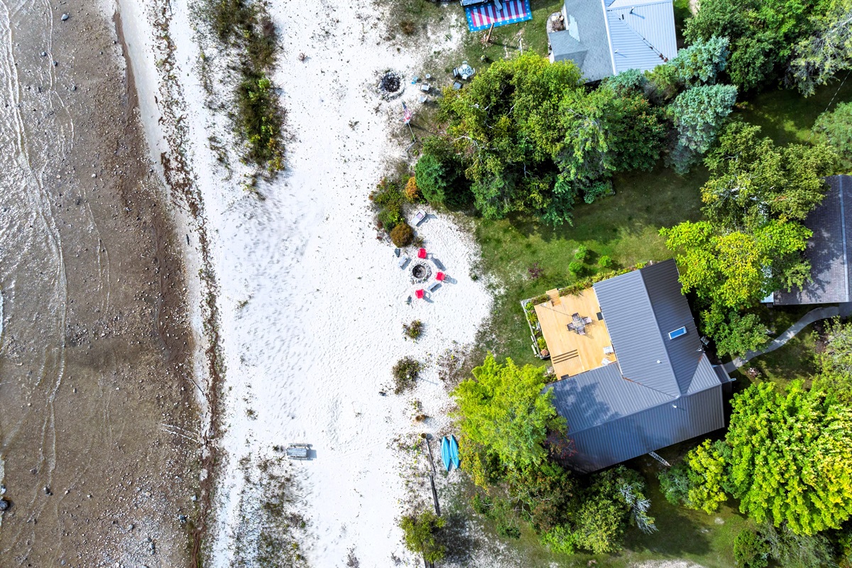 2 Bedrooms • 2 Bathrooms 2 Baths • Sleeps 1-8This stylish Lake Huron beach cottage sleeps 8 and overlooks Mackinac Island. Offering a new deck facing water, 125 feet of soft sandy beach frontage. There is a beach fire pit for those chilly evenings, large private yard, gas grill on back patio, outdoor seating, picnic table on beach and a table/chairs on the top deck. Inside there are 2 bedrooms, with 3 separated sleeping spaces, so you can have two families join and everyone has their own space. In these rooms you will find 3 queen size beds, & a full size bed, several large windows, ceiling fans, modern amenities including Central AC/Heat, new washer/dryer & Dishwasher